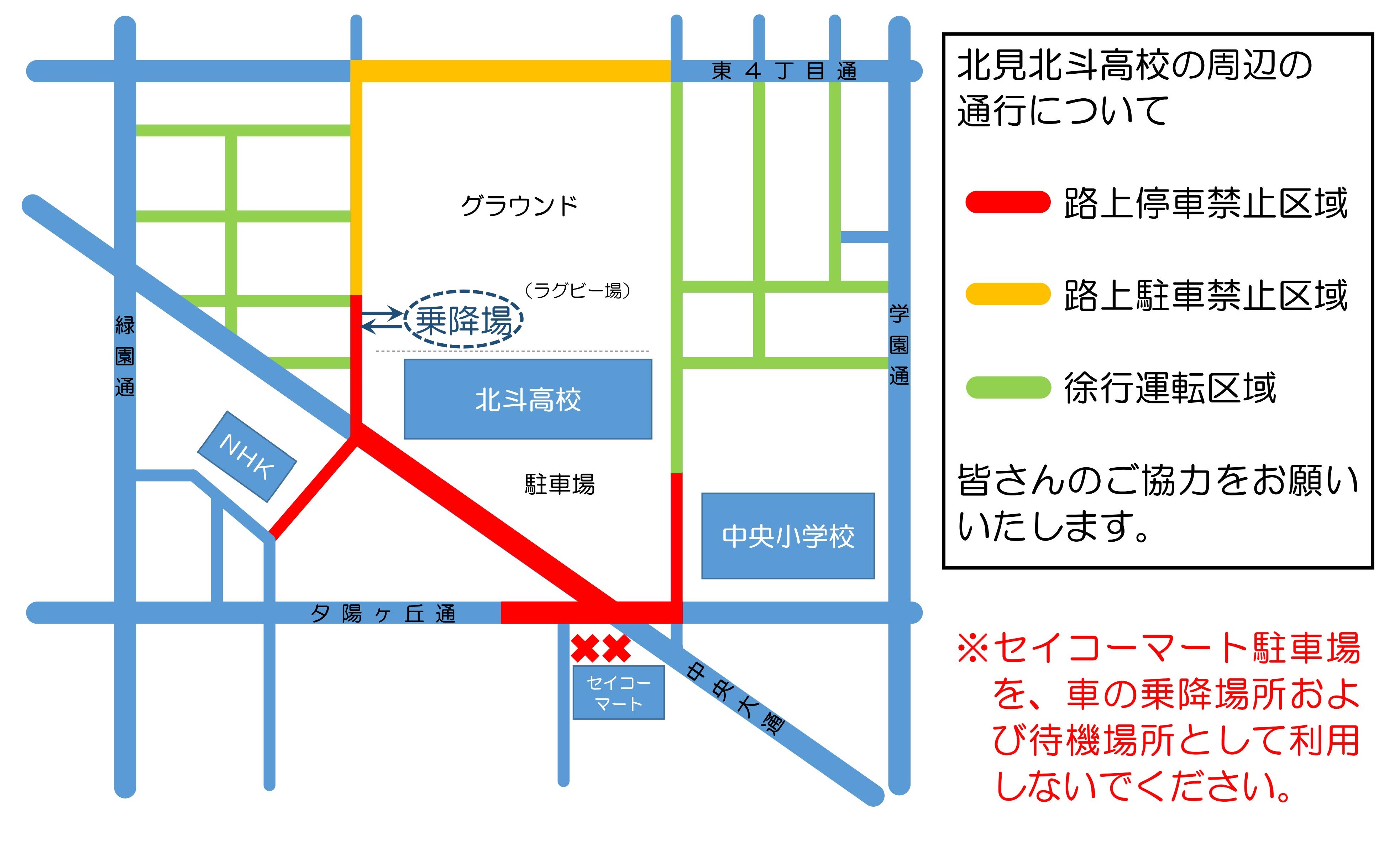 つきましては、自家用車による生徒の乗降および周辺道路の通行について、下記の通りお願いいたします。